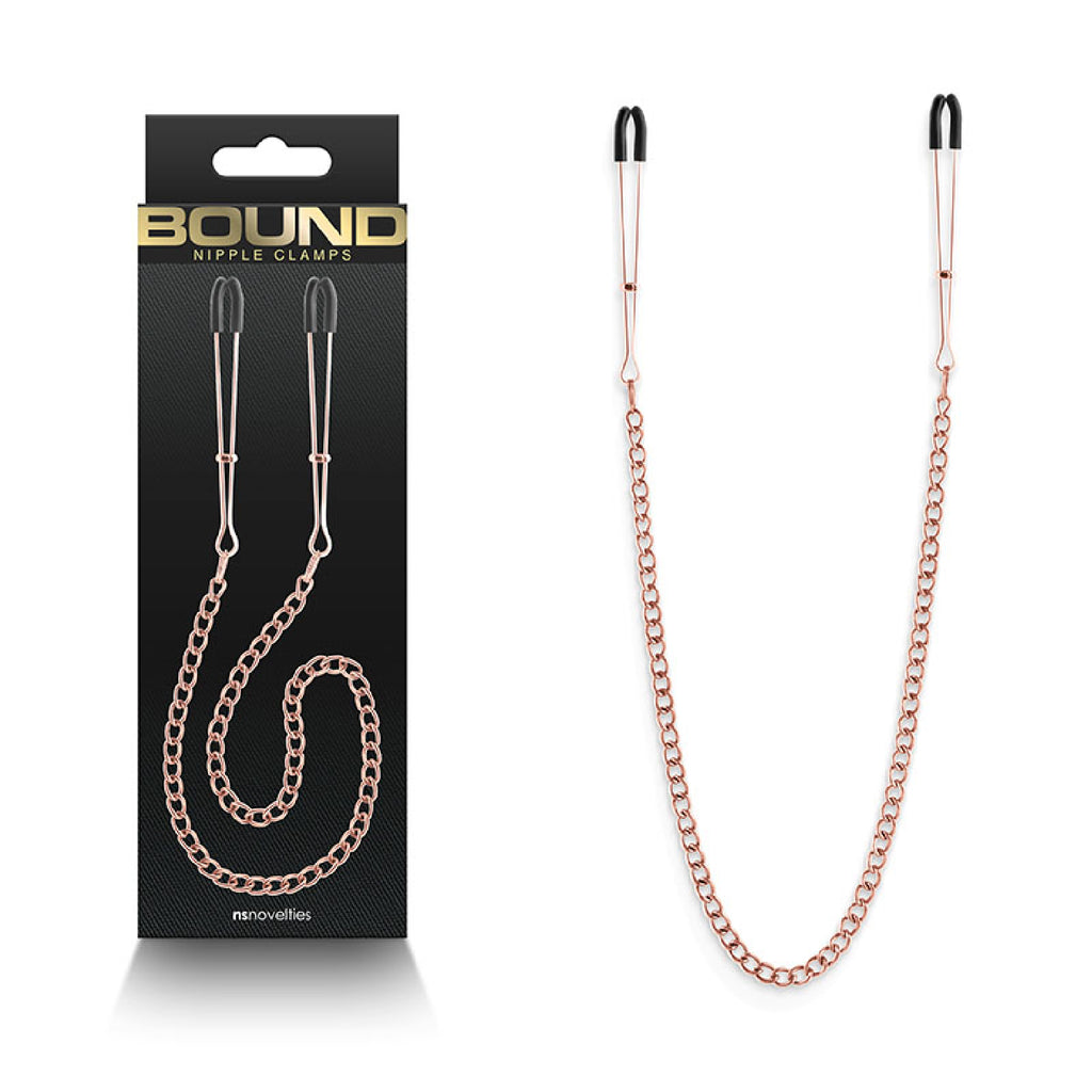 Rose Gold Nipple Clamps with Chain Bound Adjustable Nipple Clamps are for erotic and stimulating sensations. Made from nickel-free metal, Bound's clamps feature silicone tips for a better comfort and fit. Available in assorted shapes and colours.