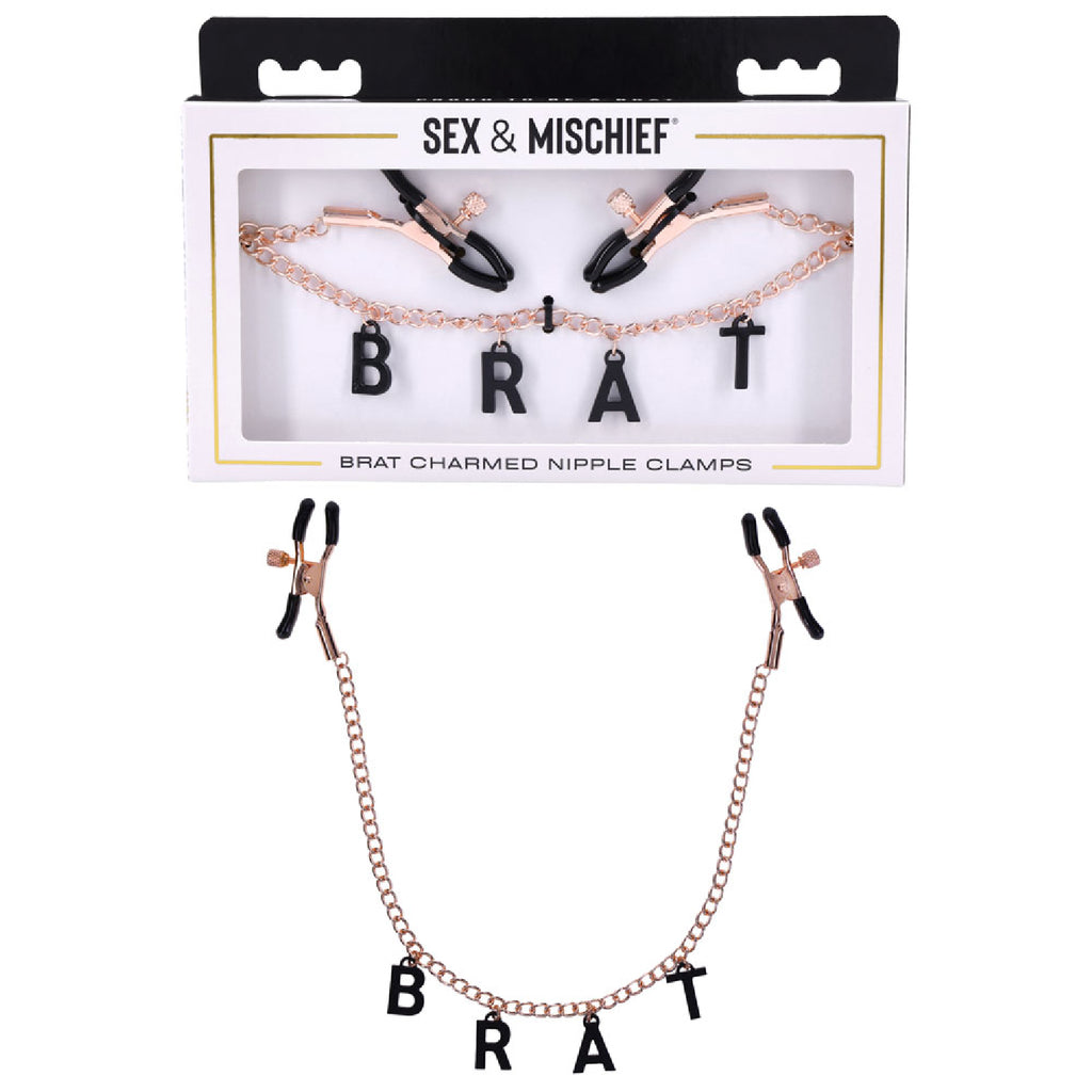 Embrace your brattiest attributes and proudly display your naughtiness with the Brat Charmed Nipple Clamps! Adjust the tension and explore pleasure at every intensity with the rubber tipped, rose gold chained nipple clamps. Own every teasing quality you love with the black charms stretched across the chain labelling you for what you love to be, a ''BRAT''! Features: - Dual Sided Adjustable Tension Rubber Tipped Nipple Clamps - Enticing Black Lettering Spelling `BRAT' - 45 cm Rose Gold Chain Material: PVC / Zinc Alloy / Iron Alloy Colour: Rose Gold