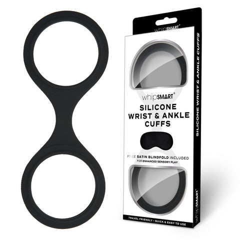The Whipsmart Silicone Cuffs are designed for both bondage play newcomers and enthusiasts alike. Enjoy simplicity with the convenient one-piece design, offering effortless restraint with cuffs that can be slipped on of off the wrists or ankles. Made from hypo-allergenic silicone, these cuffs are crafted for comfort and excitement while offering secure restraint and versatility for all users. A free satin blindfold is also included for enhanced sensory play. - Weight: 36 grams - Length: 19.8 cm - Width: 7.9 cm - Height: 0.3 cm
