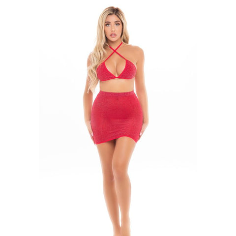 All that glitters is bold. This stunning Cherry 2-Piece Skirt Set pairs sexy and blingy fabulously. The halterneck bra helps highlight and enhance your cleavage. Meanwhile, the sparkling sheer mini skirt hints at what lies underneath.