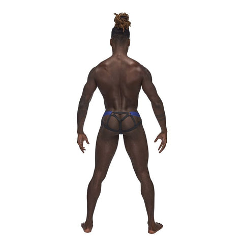 From the Sexagon collection by Male Power the Strappy ring jock with deluxe elastic back straps, including a y back thong strap, frames the exposed rear. Nickel plated rings and a plush branded printed waistband.