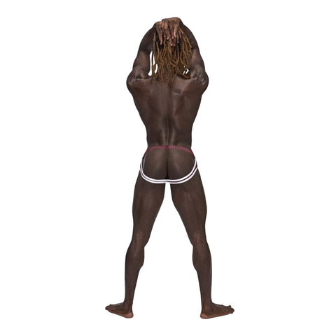From the Sport Mesh collection by Male Power, the Sport Jock, features a stay put fabric covered waistband with a logod MP tag. Plush elastane sporty striping highlights the front, and rear leg bands. Full rear exposure.