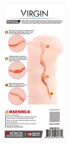 Design mimics a virginal vagina, features folds, creases, nubs along with strong tightening and insertion entrance.