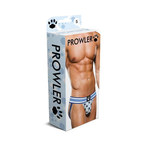 Made from a polyester and spandex blend, this jock strap features a white and blue two tone waistband, the classic Prowler paw logo stitched at the front of the waistband, and a paws design in different shades across the cup.