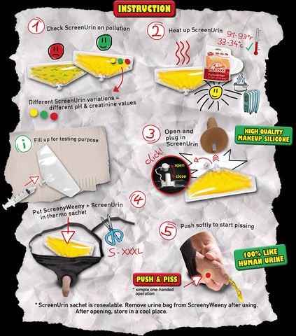 Each ScreenyWeeny is delivered with 2x 80 ml synthetic urine, an empty bag for practice, a thermo bag for keeping the urine warm, one pack of HeatPaxx and a refill syringe.