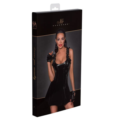 Charming short PVC dress with black zipper at the back. It features shoulder straps that are frilled for a foxy flair.