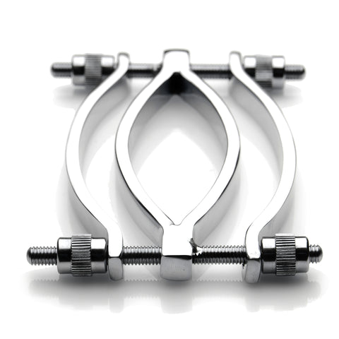 Get creative with the tease and torment of your partners most delicate parts! This clamp allows you to spread those labia wide open, granting you access to their clitoris and vagina. Use the thumbscrews to open up the exteriors of the clamp and pull their inner or outer labia through. Tighten the thumbscrews to secure the device, leaving them trapped in pinching pain and pleasure! The heavy-duty stainless steel is durable enough to last you through many years of inventive use.